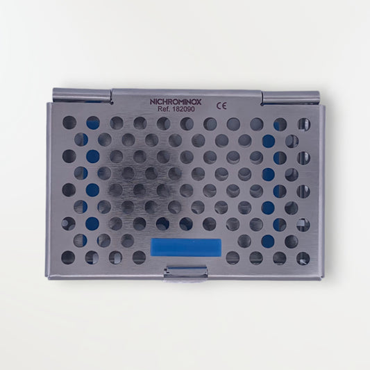 Mini cassette pour clamps en acier inoxydable. Contenance : 8 à 10 clamps. Résistante à la stérilisation. Produit Nichrominox.