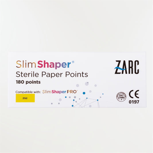Cônes de papier SlimShaper, ultra-absorbants pour un séchage efficace des canaux. Leur forme est calibrée pour s’adapter parfaitement au système SlimShaper et SlimShaper PRO.Boîte de 180 pointes, en blisters individuels de 6.