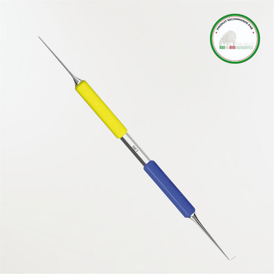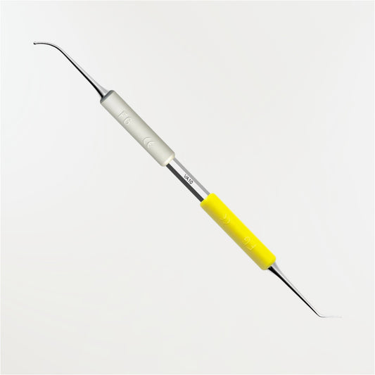 En forme d'excavateur, son arête très bien affûtée et tranchante permet d'éliminer la lésion granulomateuse sans la déchirer.