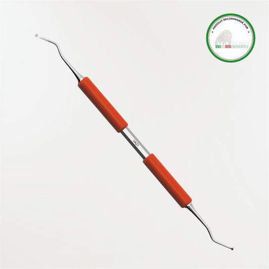 D’un côté, une fine spatule à angle pour l’application rétro de matériau d’obturation ; de l’autre, une boule pour la première adaptation du matériau.